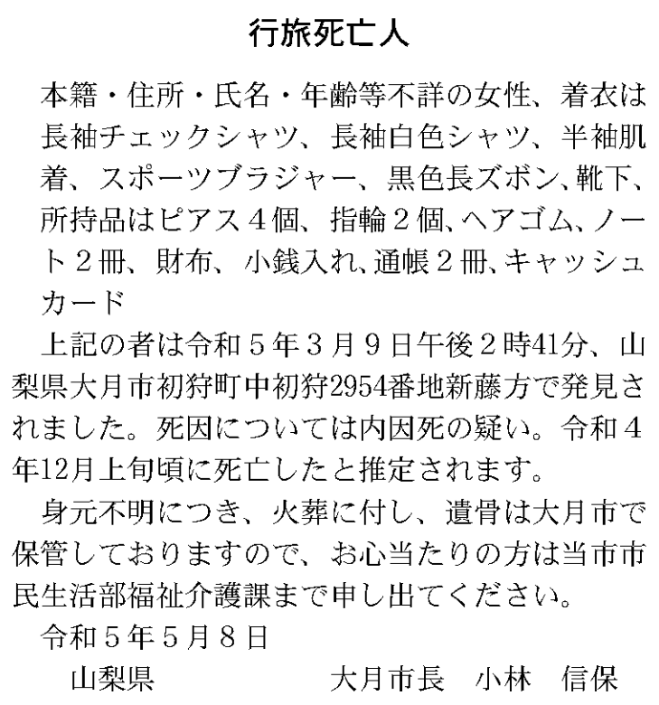 身元不明につき、 火葬に付し、遺骨は大月市で保管しておりますので、お心当たりの方は当市市 民生活部福祉介護課まで申し出てください。